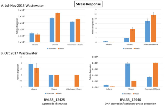 Out of the four genes upregulated in both effluents from the stress response category, BVL33_12940 was highly upregulated in the retentates. This gene was associated with DNA starvation and stationary phase protection, and was upregulated 832.9 and 3.5 times in the effluent retentate and wash, respectively. The gene was also upregulated 179.5 and 2.17 times in the chlorinated effluent retentate and wash, respectively. Another gene within this category was BVL33_00220, which encodes for an NADPH-dependent FMN reductase. This gene was upregulated 2.24 and 5.24 times in the effluent retentate and wash, and 19.19 and 27.53 times in the chlorinated effluent retentate and wash, respectively (Table 1).