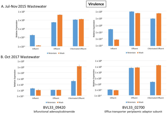 RecB recombinase, encoded by BVL33_02390, was upregulated 5.06 and 4.66 times in the effluent retentate and wash, respectively, and 8.33 and 6.01 times in the chlorinated effluent and wash, respectively. BVL33_06310 encodes for an outer membrane protein assembly factor. This gene was upregulated 2.45 and 5.89 times in the effluent retentate and wash, respectively, and 2.96 and 3.42 times in the chlorinated effluent retentate and wash, respectively.