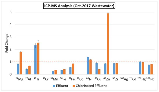 Fold Change of Metal Concentration in the effluent and chlorinated effluent in October 2017. Fold changes are measured with respect to the concentration in the influent. A fold change value of 1.0 implies no change (red dashed line). The numbers in superscript denote the atomic mass of the metal. Raw values of each ion as measured by ICP-MS are listed in Table S6.