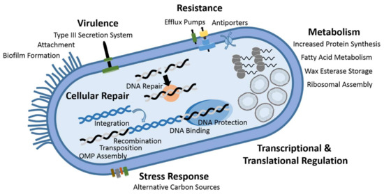 Given the ubiquitous detection of members of the genera Acinetobacter in diverse environments including activated sludge [29], different stages of WWTPs [30], hospital effluent [31], clinical samples [32] and environmental samples [21,33,34], we hypothesize that Acinetobacter spp. may utilize several strategies to facilitate their survival and persistence. In this study, we further utilized A. junii, which was detected to be ubiquitously present in samples collected from different stages of the WWTP, as a model bacterium to address this hypothesis. It was hypothesized that A. junii upregulates specific genes to allow for its survival in the harsh environments of a WWTP. To determine this, A. junii from different stages of a WWTP serving a university campus is studied by RNA-seq. This overcomes the biasness of PCR and captures global changes in transcriptional activity of Acinetobacter spp. before and after wastewater treatment. Results indicate an increase in relative abundance of Acinetobacter spp. down the treatment process with a concomitant increase in transcriptional activity. Majority of the upregulated genes correspond to cellular resistance and metabolism. Other upregulated genes encode for metal-resistance, efflux pumps and mobility proteins, all which have been implicated in conferring antibiotic resistance and increased survivability in harsh environmental conditions.