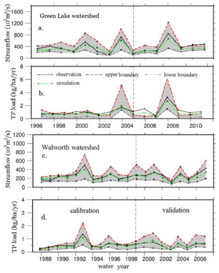 - Moriasi, D.N.; Arnold, J.G.; Van Liew, M.W.; Bingner, R.L.; Harmel, R.D.; Veith, T.L. Model evaluation guidelines for systematic quantification of accuracy in watershed simulations. Trans. ASABE 2007, 50, 885–900. [Google Scholar] [CrossRef]