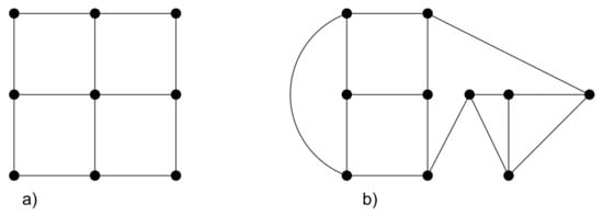 Square grids: A lattice graph, mesh graph, or grid graph is a graph whose drawing, embedded in some Euclidean space , forms a regular tiling [3]. This type of graph may more shortly be called just a lattice, mesh, or grid. A particular type of two-dimensional lattice graph (indicated with , and also known as square grid graph) is the graph whose vertices correspond to the points in the plane with integer coordinates, x-coordinates being in the range , y-coordinates being in the range , and two vertices are connected by an edge wherever the corresponding points are at distance 1 from each other (see Figure 1a). In other words, it is a unit distance graph for the described point set. A two-dimensional grid graph, also known as a square grid graph, is an lattice graph . In this paper, the two-dimensional square grid graph was considered, with a number of nodes equal to , 100, 1024, 10000, and 34969 (respectively, named SG1, SG2, SG3, SG4, and SG5). In this way, a benchmark value was obtained for the entire size range of the studied networks. In fact, the largest considered square lattice has a number of nodes similar to the largest WDN considered in the paper (Chihuahua, for which ).