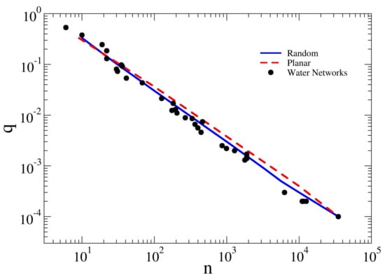 In Figure 2, the relationship between the link density q and the number of nodes n for the analyzed WDNs is plotted in log–log scale. It can be noticed that the two groups of WDNs (synthetic and real) follow the same trend with . Specifically, for increasing n, the link density tends to zero and closely follows a power-law with exponent , as reported in [27] for other real-world networks (linguistic systems, power grids, actor networks and biological systems). The link density shows a well defined scaling behavior, resulting inversely proportional to the network size n. It is worth highlighting that both square grids and random regular graphs show the same trend, meaning that water distribution networks are equally sparse in these two types of graph. In fact, link density is strongly related to the average node degree, which is not significantly different for WDNs, SG, and the considered RG. Such a similar behavior can be interpreted by means of Equation (1). In fact, introducing in Equation (1) the well-known topological relationship , linking the number of pipes m, nodes n, and loops r of a network, it results . As in WDNs it is r << (n− 1), the second term is always smaller than the first, so that q = 2/n. SG and RG are instead more looped than most WDNs. In fact, in Figure 1, it is clear that the link density is slightly higher for SG and RG, which is due to the presence of a greater number of loops (according to the above relationship), as shown in Table 1. In this regard, since the number of loops can be regarded as a robustness metric, clearly the link density can be used as a surrogate metric for the robustness of WDNs. In fact, it takes into account the number of nodes, pipes and, implicitly, the number of loops.