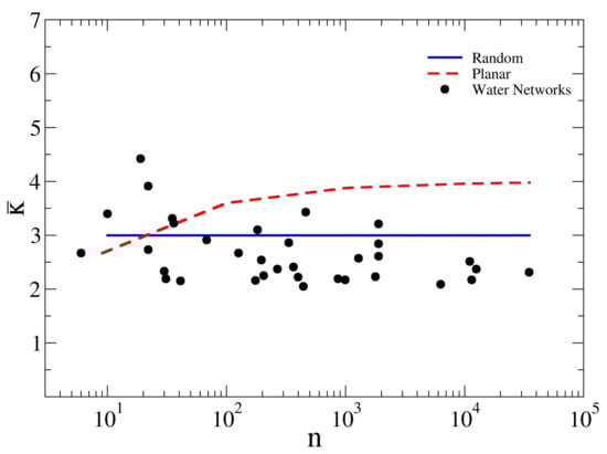Relationship between the average node degree and the network size n compared to the case of random regular networks and planar square grids. Notice that, due to boundary effects, the square grids approach their theoretical value only for large network sizes n. The blue continuous line and the broken red line refer to random graph and square grids, respectively. The black dots represent the studied WDNs. For numerical values, please see Table 2.
