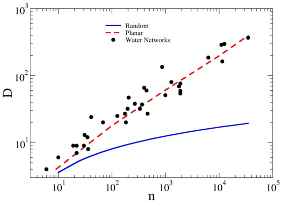 Plot of the diameter D versus the network size n for synthetic and real water networks, planar square grids and random graphs. Notice that, similar to planar square grids, water networks also show the scaling that is expected for planar spatial networks. The blue continuous line and the broken red line refer to random graph and square grids, respectively. The black dots represent the studied WDNs. For numerical values, please see Table 2.