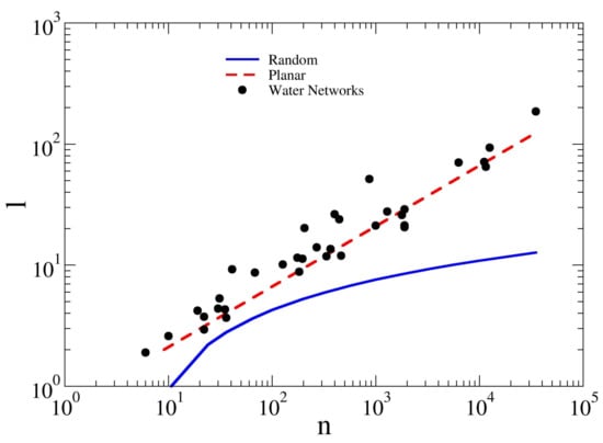 Plot of the average path length l versus the network size n for synthetic and real water networks, square grids and random graphs. Notice that, similar to planar square grids, water networks also show the scaling that is expected for planar spatial networks. The blue continuous line and the broken red line refer to random graph and square grids, respectively. The black dots represent the studied WDNs. For numerical values, please see Table 2.