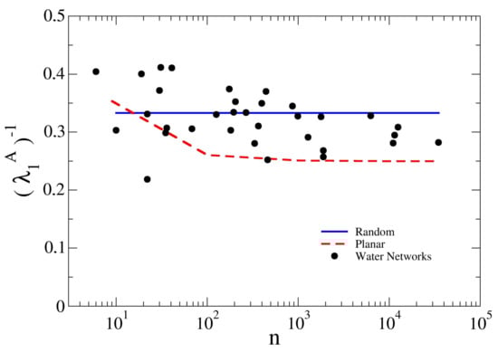 In Figure 6, the inverse of the spectral index is plotted in semi-log scale as a function of the water distribution network size n. It is possible to identify a typical WDN range with , and so for , which is related to the general relationship according to which [33]. For this reason, the inverse spectral radius of cubic random graphs assumes the constant value , while for square grids it tends asymptotically to (for these networks the maximum node degree is equal to 4 and the larger the number of the network nodes, the fewer of them are boundary nodes, which have a degree smaller than 4). Finally, for the water distribution networks, is nearly invariant with the size of the network. It means that, even if the size of the water network increases, the topology does not vary. Since the spectral radius is linked to the “velocity of spread” of a substance in the presence of percolation dynamics, it means that for WDNs it is possible to define a characteristic value of the intrinsic capacity of being crossed by a substance, water flow or contaminant. In this regard, the nearly invariant value of the spectral index suggests that, in general, the probability of the spreading of a contaminant from a point to another in a WDN does not depend on its dimension, as, apart from the hydraulic characteristics of the system, it is strongly related to the number of connections of each node. The value of the spectral index for WDNs falls between that of RG and SG as the number of nodes increases. It can be observed that the SG are the most vulnerable in terms of substance spreading, since most of the nodes have a degree equal to 4, while the RG, having a degree equal to 3 for all nodes, show the lowest value of . For WDNs, even if the average node degree is usually lower than RG, the small fraction of nodes with a degree higher than 3 gives WDNs a higher capability of being crossed by a substance. It can also be observed that the relation indicates that the spectral radius simultaneously quantifies global and local connectivity of the network. In fact, the lowest bound is related to the number of loops, while the highest is related to the presence of hubs.