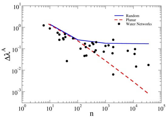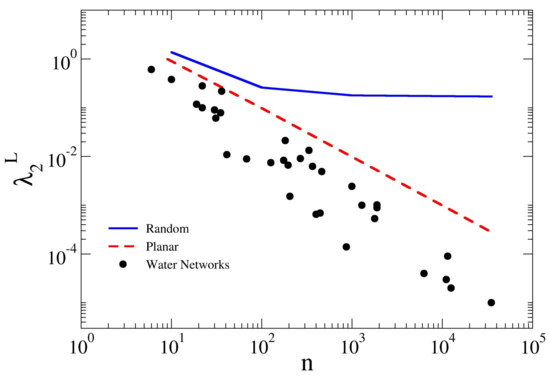 In Figure 7, the behavior of the spectral gap is plotted in log–log scale as a function of the network size n. A decreasing trend of the spectral metric with increasing size is visible for all the studied networks, which could be fitted with a power scaling law . While, for square grids and random graphs, the trends are quite clear—respectively, a power law decay and an exponential decay to a plateau—for WDNs, the trend with network size is less clearly defined. However, the dots representing the studied WDNs fall between the trend lines of square grids and random graphs. As a small indicates high probability of having articulation points or bridges (the failure of which can cause the disconnection of the network in more sub-regions), this result points out that large WDNs tend to be increasingly less robust against disconnection. It is also clear that random graphs show a higher robustness than the square grids, since they show a higher value of the spectral gap . This is due first to the fact that the chosen cubic graphs have constant average node degree which guarantees that all nodes are linked to other three nodes. Furthermore, their randomness ensures the presence of long-range links that lead to a more cohesive and compact structure. Clearly, this metric does not depend on the number of connections, but rather on how nodes are connected to each other. In fact, the SG have highest , but at the same time they show the smallest spectral gap. In this respect, the possible presence of few long-range links gives some randomness to WDNs, thus resulting more similar to RG. This behavior resembles the concept of Pseudorandom graph (e.g., Torres et al. [18]), in which random connections are allowed only between neighboring nodes.