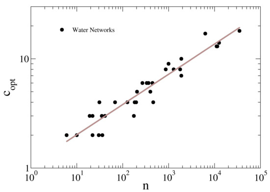 Given a graph , a community (or cluster, or cohesive subgroup) is a sub-graph , whose nodes are tightly connected, i.e., cohesive. The community structure of the complex network systems constitutes a powerful tool for better understanding the functioning of the network itself, as well as for identifying a hierarchy of connections within a complex architecture. Different metrics can lead to different communities; however, for physical networks, one of the most natural methods to partition its graph in reasonable communities is spectral partitioning [62], since it allows the separation into subgraphs minimizing the number of links between such subgraphs. Spectral partitioning uses the eigenvectors of the Laplacian matrix of a graph to determine the subgraphs corresponding to separate communities. To optimize the number of such communities, it is customary to look at the eigengap, i.e., at the maximum jump in the spectrum of the Laplacian matrix. According to such a criterion, only the eigenvectors whose eigenvalue is smaller than the eigengap are used to partition the network; in this regard, it has been shown that the eigengap can constitute a valid and useful tool to solve the problem of establishing a preliminary number of districts for the water network partitioning [16], according to only topological criteria, especially when no other information is available. In Figure 9, the first largest eigengap of the Laplacian matrix is used to calculate the optimal number of cluster as a function of the network size n. It looks clear how the number of clusters in which the water distribution networks are divided according to increases with the system size. In particular, it follows approximatively a power law . Hence, the number of districts grows sub-linearly with the network size, indicating that the optimal number of districts does not increase significantly with system size. It is worth noticing that, since grows sub-linearly, the number of partitions grows more slowly than the number of elements of the network. Hence, for large water networks, the size of optimal districts grows, compared to small water networks. It is worth noting that this result holds for network partitioning only from the topological point of view, while also the aims of the sectorization of the network should be considered in the choice of the optimal dimension of districts. In fact, it is known that the larger districts are, the more difficult is the identification of bursts and leakages from night flow data, although smaller districts imply higher costs for valves, flow meters and maintenance. Conversely, in terms of network safety against accidental or intentional water contamination, the larger is the district, the larger is the number of users potentially exposed to injected pollutants.