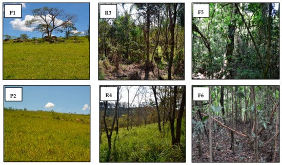 Pictures that represent the study sites in the seasonal semi-deciduous forest in Campinas, Brazil. Study sites are abbreviated with P1 and P2 for pasture, R3 and R4 for restored forest, and F5 and F6 for remnant forest.