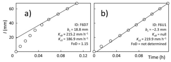 Illustrative examples of the influence of the shape of the cumulative infiltrations on the discrepancies occurring between the Beerkan method (BEST-steady) and the steady-state phase of a Beerkan infiltration (SSBI) method. (a) Concave-shaped cumulative infiltration curve in which the intercept, bs (mm), of the straight line interpolating the last I vs. t data points is positive and the FoD between the saturated soil hydraulic conductivity values estimated with BEST-steady (KsB) and the SSBI method (KsS) is small. (b) Convex-shaped cumulative infiltration curve with a negative intercept yielding null KsB.