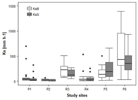 The failure in the BEST-steady algorithm is reported by several studies in subtropical soils, where OC exceeds 5%. This failure is normally related to the occurrence of hydrophobic conditions [,,]. Nevertheless, our soils showed lower OC values (less than 5%). In addition, the soil hydrophobicity is a complex property and poorly studied in tropical soils [,]. Other factors that probably contributed to the BEST-steady algorithm failure are the heterogeneous soil structure, changes in soil structure during measurement, initial soil moisture, and temperature [,]. For these reasons, the failure of the BEST-steady algorithm should be addressed in detail by future studies, considering detailed physical, chemical and mineralogical analyses. Hereafter, for the sake of reliable Ks values and comparison across study sites, only the KsS values estimated using the SSBI method were considered. This choice was supported by the fact that the SSBI method allowed us to maintain the integrity of the dataset. In addition, the KsS values ranged between 3 mm h−1 and 934 mm h−1, with a high variability inside all study sites.