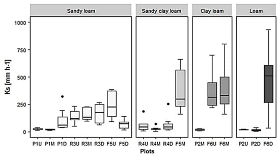 Evaluating the surface Ks values by soil texture, greater Ks variation was found in soils with higher clay content, contrasting with lower variation in soils with higher sand content. Also, soils with higher sand content did not show the higher Ks. In general, the lowest Ks values occurred in pasture plots, for example, in pasture P1 the Ks ranged from 10–320 mm h−1, and in pasture P2 Ks ranged from 4–37 mm h−1, whereas the highest Ks values were observed in most remnant forest plots. The sandy loam texture highlighted the large differences between Ks in the restored forest R3 and pasture plots (P1U and P1M). In this case, the Ks in the restored forest R3 varied from 49–267 mm h−1, with the higher Ks evidenced at the restored forest plot R3D (average of 180 mm h−1); moreover, the Ks was similar to the pasture plot P1D (average of 110 mm h−1) and most remnant forest plots. For the remnant forest F5, the Ks varied from 18–660 mm h−1, showing the higher Ks at remnant forest plot F5U (average of 247 mm h−1), which differs from pasture plots (P1U and P1M) but not from restored forest R3. In contrast, the Ks at remnant forest plot F5D (average of 68 mm h−1) exhibited a similar Ks in relation to pasture and restored forest plots. For the sandy clay loam texture, the Ks in the restored forest R4 (from 6–256 mm h−1) was significantly different from the remnant forest plot F5M (average of 68 mm h−1); furthermore, all the plots in the restored forest R4 had low Ks variability, similar to the pasture land cover. Finally, clay loam and loam textures showed the same comparison among land covers, characterized by marked differences between lower Ks in pasture 2 and higher Ks in the remnant forest F6. In particular, the remnant forest F6 evidenced the higher Ks variability (from 33–934 mm) in the study sites (Figure 4).