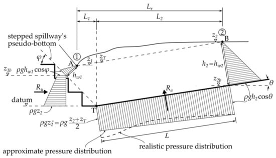 where z1b is the pseudo-bottom elevation at Section 1, z2 is the water level at Section 2, and L is the streamwise distance from point T to the end of the hydraulic jump roller at Section 2, which can be obtained as L = (Lr – L1)/cos θ + h2 tan θ. Equation (2) can be written in a simplified form: