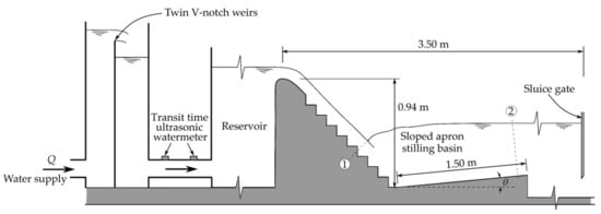The experiments were performed in the Hydraulic laboratory of the Civil Engineering Faculty at the University of Belgrade. A scale model of the stepped spillway (Figure 2), 0.94 m high (from the weir crest to the spillway toe), and 0.46 m wide, was constructed. The angle of the chute pseudo-bottom was φ = 45°. The chute consisted of 17 steps with the height of each step being s = 0.045 m. Downstream of the spillway, a 1.5 m long hinged sloped apron was constructed. Four angles of the apron were examined, θ = {0°, 2.5°, 5°, 7.5°}. The tailwater level was controlled by a sluice gate. The total length of the flume, from the weir crest to the gate was 3.5 m.