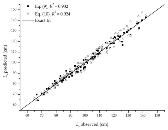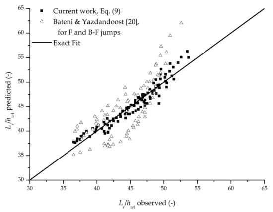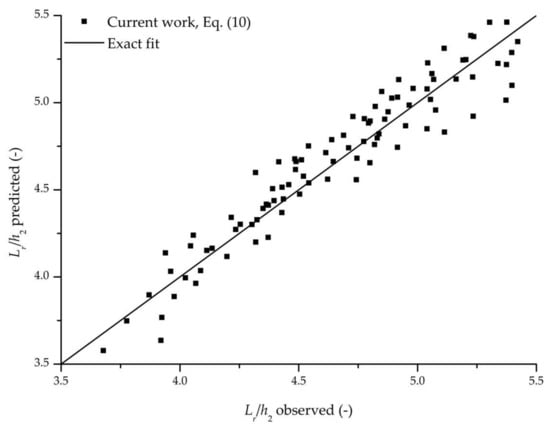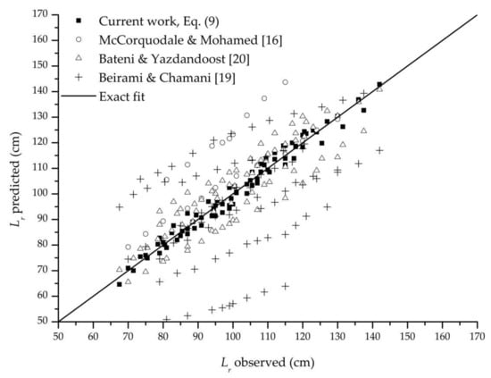 and the observed and the predicted values for Lr/h2 and Lr based on the Equation (10) are presented in Figure 5 and Figure 6. Along with R2 values, normalized root mean square errors (NRMSEs) have also been determined as: