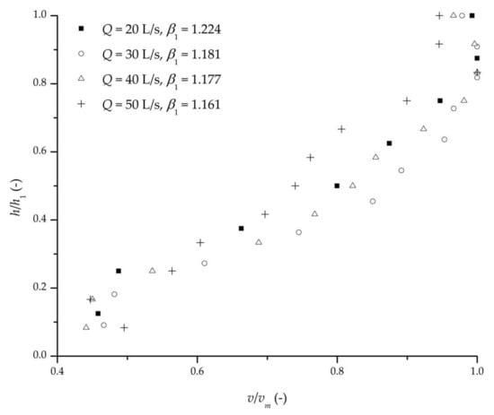 Relative velocity profiles at Section 1 for L1 = 13.5 cm, where vm is the maximum profile velocity.
