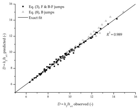 The exact forms of the expressions (5) were estimated from experimental data. Based on the Equations (3) and (5), the observed and predicted sequent depth ratios, D, and sequent depths, h2, were calculated.