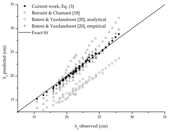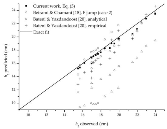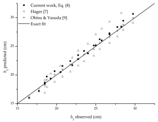 where Xobs and Xpred are observed and predicted valued of the hydraulic jump characteristics, and N is the total number of tests (N = 104). The NRMSE of Equation (9) was determined to be 6.63%, while Equation (10) had 6.47%. This shows that both proposed empirical expressions (Equations (9) and (10)) agree well with the experimental results (Figure 3, Figure 4, Figure 5 and Figure 6). However, the use of the Equation (9) is preferred since it does not require the estimation of the depth h2. Thus, the use of Equation (9) should reduce the total uncertainty of the method. This was easily shown by the NRMSE values for the estimation of the Lr. Normalized RMSE of the Equation (9) was 3.15%, and of the Equation (10) was 4.51%.
