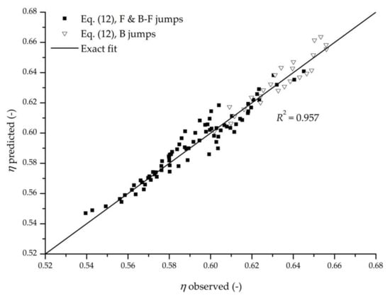 where b = 0.028(tan θ)−0.09 for F and B-F jumps, and b = 0.0395 for B jumps. Figure 12 shows the observed and predicted values of η. Results in Figure 12 display better agreement of Equation (12) for B jump than for F and B-F jumps. The reason for this may be due to the larger number of parameters for F and B-F jumps.