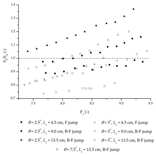 The advantages of sloped apron hydraulic jumps must also be assessed by comparing h2 with hB for the equivalent classical hydraulic jump on a flat bed. For configurations with h2/hB < 1, sloped apron stilling basins reduce the downstream sequent depth, and they can be used instead of classical stilling basins. Figure 13 shows the decrease of h2/hB with the decrease in F1, i.e., with the increasing discharge. This can be explained by the increase of the incoming flow force exerted on the apron, which in turn increases the apron reaction force. Figure 13 shows that the slope of h2/hB = f(F1) has a low dependency on θ but is strongly dependent on L1. Ratio h2/hB decreases with decreasing L1, which agrees with the findings by [7,8,18]. The minimum value of h2/hB (0.736) was obtained for θ = 5°, L1 = 4.5 cm and Q = 51.9 L/s, while the maximum (1.368) was obtained for θ = 2.5°, L1 = 13.5 cm and Q = 20.5 L/s. For θ = 7.5°, the hydraulic jump could not be established with L1 < 13.5 cm due to the length of the apron, which limited the minimum values of z2 (the tailwater level). All B jump configurations had h2/hB values higher than 1, since the transformation of the classical hydraulic jump to B jump requires an increase in tailwater level z2 (i.e., moving Section 1 in the upstream direction).