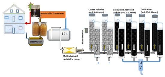 Anaerobically treated blackwater effluent from a lab-scale anaerobic sludge blanket reactor [24] was collected in a 12 L storage tank and used as an inlet for a column filtration study. The composition of the effluent with respect to organic matter (both total and dissolved), total suspended solids (TSS), pH, and dissolved nutrients (mainly NH4–N and PO4–P) and E. coli were analyzed using standard methods as described in Section 2.3.