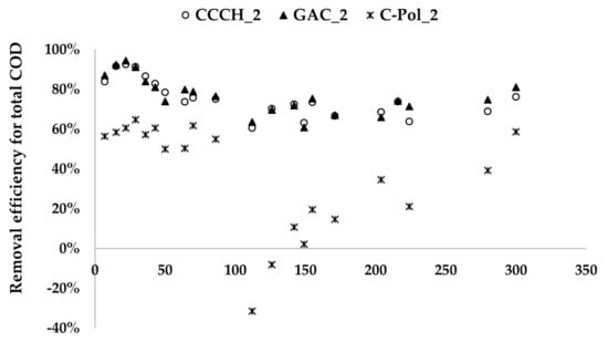 Total chemical oxygen demand (COD) (top) and filtered COD (bottom) removal efficiency of Cocos char (CCCH_2), granular activated carbon (GAC_2), and coarse polonite (C-Pol_2).