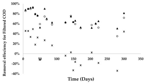 As shown from Figure 2, both Cocos char and granulated activated carbon filters columns had similar effects (p > 0.05) and removed on average about 80% of residual total COD and 73% of the residual filtered COD. The removal efficiency of the carbon filters for both total and filtered COD were also stable during the eight-month operation. Most of the removal of COD in both treatments occurred in the upward flow mode. The contribution of the downward unsaturated flow mode was, however, insignificant (p = 0.32). The average removal efficiency of polonite for both total and filtered COD was not substantial. During the eight-month operation period, the removal efficiency in the polonite column was only 43% and 12% for the total and filtered COD, respectively. Figure 3 shows the total and filtered COD concentrations during the filtration study period. The filtered organic matter in the polonite columns’ effluent reached saturation after 50 days (Figure 3 (right)). It was also observed that the removal efficiency for filtered COD became negative after 100 days, probably due to dissociation of soluble organics form the biofilm that developed over time.