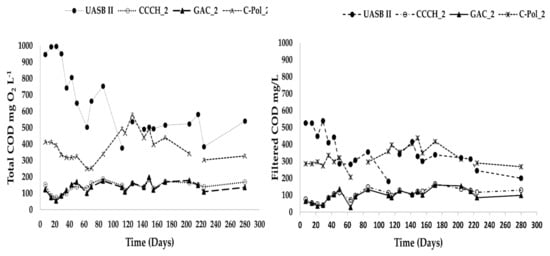 Total (left) and filtered (right) COD for the effluents of the anaerobic reactor (UASB II) and post-filter column effluents—Cocos char (CCCH_2), granular activated carbon (GAC_2), and coarse polonite (C-Pol_2).