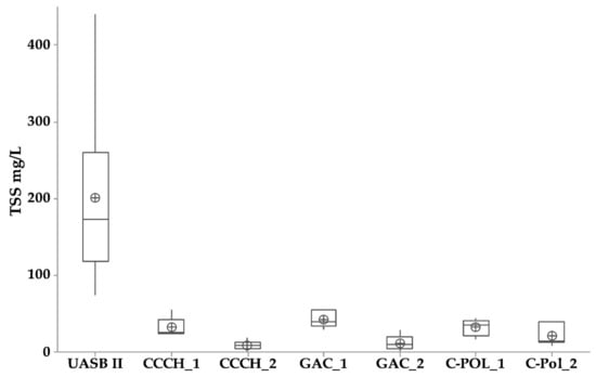 Total suspended solids (TSS) concentration of effluents of the UASB anaerobic rector (UASB II), upflow Cocos char column (CCCH_1) downflow Cocos char (CCCH_2), upflow granular activated carbon (GAC_1) downward granular activated carbon (GAC_2), upflow coarse polonite (C-Pol_1) and downflow coarse polonite (C-Pol_2).