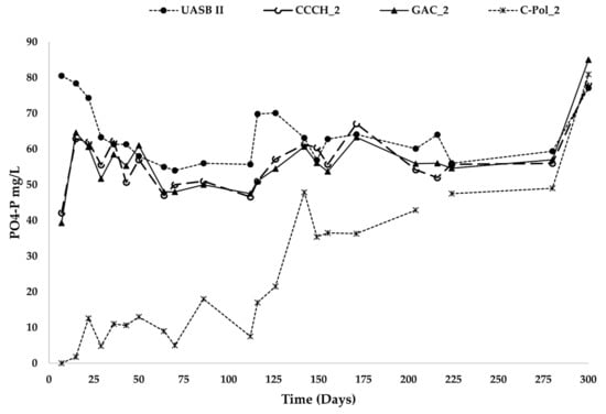 PO4–P concentrations in the liquid-phase for effluents of the anaerobic reactor (UASB II) and filtration columns—Cocos char (CCCH_2), granular activated carbon (GAC_2), and coarse polonite (C-Pol_2).