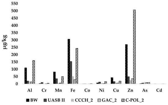 Figure 8 shows the concentration of selected micronutrients and heavy metals in the raw blackwater, anaerobically treated effluent and filtration effluent. The heavy metal concentrations particularly As (<10 µg/L), Cd, Cr, Co., and Ni in the raw blackwater as well as in the effluents were lower than even the threshold level in drinking water stated in the guidelines for drinking-water quality [38] suggesting low heavy metal risk if sanitized blackwater is used as source of plant nutrients. The heavy metal concentration in blackwater was by far lower than their presence in sewage sludge, livestock manure and artificial fertilizer, and comparable results were reported in the Netherlands [39]. As shown from Figure 8, the carbon filter columns substantially reduced Al, Fe, Mn, Cu and Zn minimizing. On the other hand, the concentrations of Al, Fe, Mn and Zn in the polonite effluent are higher than the corresponding values in the anaerobically digested effluent. This might be due to the fact that polonite contains Ca, Al and Fe silicate as the main components and small fraction of Mn. The relatively high concentration of these heavy metals in polonite-filtered effluent could result from dissolution of these elements from the polonite.