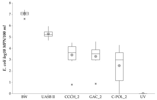 E. coli concentration of the raw blackwater (BW), reactor effluent (UASB II), in the effluents of filtration columns—Cocos char (CCCH_2), granular activated carbon (GAC_2), and coarse Polonite (C-POL_2) at different levels of treatments, and after ultraviolet light treatment (UV).