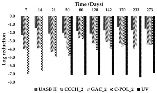 Cumulative log reduction E. coli of by the different treatments (reactor effluent (UASB II), in the effluents of filtration columns—Cocos char (CCCH_2), granular activated carbon (GAC_2), and coarse polonite (C-POL_2) at different levels of treatments, and after UV treatment (UV)) at different sampling times during the study period.