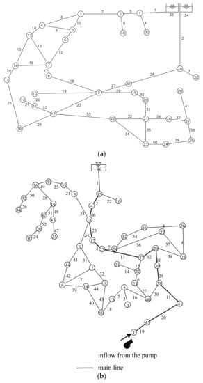 WDNs for the two case studies. Pipe numbers close to the pipes. Numbers of demanding nodes inside circles. (a) First case study has source Nodes 33 and 34. (b) Second case study has pump inflow at Node 1 and source Node 46. Main interconnection line is between the pump and source node.