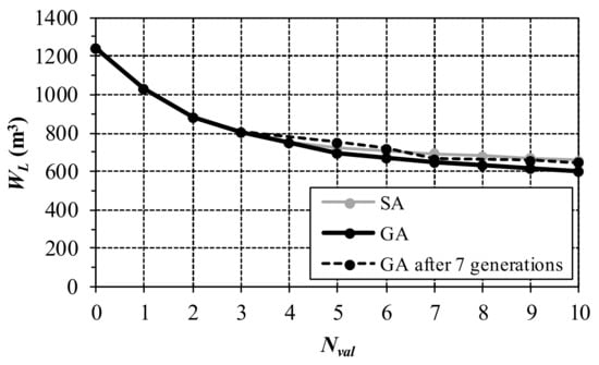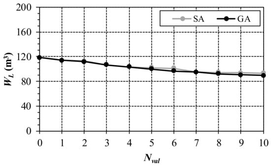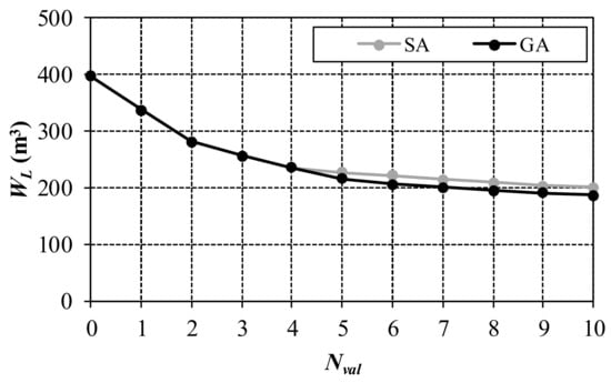The tradeoff curves of WL as a function of Nval obtained with SA and GA in the first leakage condition are reported in Figure 2. As for GA, two Pareto fronts are shown, the final one (after 50 generations) and that after seven generations. The latter is associated with 350 objective function evaluations (very close to SA). Though GA explored solutions with Nval values up to np (see Section 2.3), only the solutions with Nval ≤ 10 were reported in the graph for a consistent comparison with SA. This graph shows that the curve of SA and the final curve of GA have identical trend up to Nval = 3. To the right of Nval = 3, the curve obtained with GA dominates that of SA, in that it provides lower values of WL for each value of Nval. Furthermore, the distance between the two curves increases as Nval grew. This seems to suggest that, for low number of Nval, SA can provide identical or close results to those of GA. Conversely, for high number of Nval, the better performance of GA stands out, due to the wider exploration of the research space. However, this comes at an about seven times larger computational cost. As was expected, the curve of GA after seven generations features worse solutions than the final curve of GA to the right of Nval = 3. The curve of GA after seven generations enables the results of GA to be compared with those of SA, given the same computational budget. Interestingly, neither curve prevails in absolute terms. In fact, identical solutions are observed up to Nval = 3. GA after seven generations is slightly better for Nval = 7, 9 and 10, while not offering any solutions for Nval = 8. SA, instead, is better for Nval = 5 and 6. Summing up the results in Figure 2, the better performance of GA stands out only with a higher computational budget.