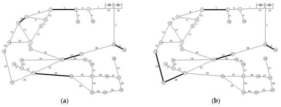 First case study. Optimal location of five valves for: (a) SA; and (b) GA. Valve locations indicated with thick lines.