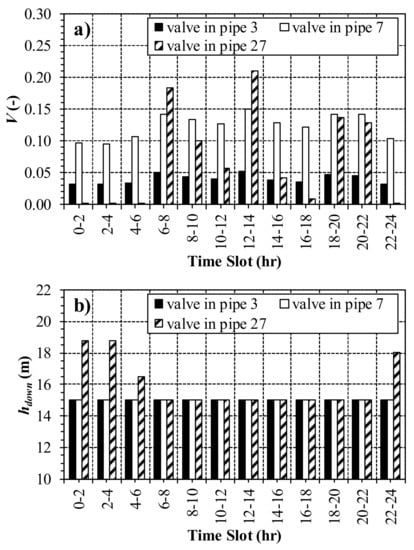 Another example of the results obtained is provided in the graphs in Figure 4, associated with the optimal location of three valves, installed in Pipes 3, 7 and 27, respectively, for both SA and GA. Figure 4a shows the temporal pattern of V, optimized through the iterated LP at each time slot. Figure 4b shows the pressure head hdown at the downstream node, which can be used as the time varying setting to be prescribed if the water utility chooses to perform the pressure regulation by means of pressure reducing valves (PRVs). In fact, PRVs has the downstream pressure head as setting. This variable is always equal to hdes (that is 15 m) at the valve in Pipe 3 because the downstream node of Pipe 3, namely Node 32, is a terminal node of the network. It is always equal to hdes also for the valve in Pipe 7, though the downstream node of this pipe, namely Node 3, is not terminal. This happens because the descending topography downstream of Pipe 7 facilitates the meeting of the pressure requirements. The case of the valve in Pipe 27, which has Node 9 as downstream node, is similar. However, this valve cannot reduce hdown to hdes at nighttime, even if it is almost fully closed (V ≈ 0).