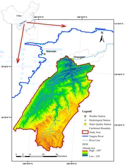 This study was implemented in the Modaoxi River watershed, which is located in the middle reaches of the Yangtze River in southwestern China. The Modaoxi River extends from the north side of Wulingshan Mountain and drains into the Yangtze River at Wanxian in Chongqing, as the Yangtze tributary on the right bank. The portion of the Modaoxi River watershed located above the Changtan hydrologic gauge and water quality monitor station (108.62° E, 30.75° N), with an area of 1984 km2, was used as the study area. It is an area dominated by natural and cultivated lands with approximately 57% forest, 19% grass and 24% active agricultural landuse cover. The watershed lies on the border of Chongqing and Hubei provinces, with approximately 27.8 thousand people living in towns and villages. The main geographical and environmental attributes of the study watershed are shown in Figure 1.