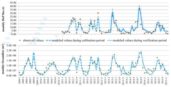 Comparison of observed and modeled monthly streamflows and Dis-P fluxes during the research period. The error bars were the uncertainties in model outputs.