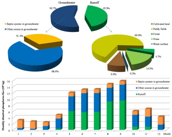 Based on the outputs of the model applications, the non-point sources from farmland discharge through runoff and septic systems discharge through groundwater were detected as the current main contributing sources of Dis-P in studied watershed. The fluxes and source apportionments of Dis-P were variable in different months, in accordance with previous studies [34,46,47,49]. Furthermore, the changes in climate status would generally increase the Dis-P fluxes and convert the initial source apportionments of watershed Dis-P contributions that were critical for local pollution source management.