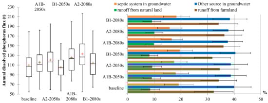 Additionally, the fluxes and source apportionments of Dis-P were variable in different months. The average monthly Dis-P fluxes were different in different months, and the high fluxes were mainly distributed from May to September. In addition, runoff was the primary route for Dis-P contribution during high-flux months with high streamflow yields. For the other months, the groundwater was generally the primary pollution route, among which the contribution from septic systems was the primary source in the low-flow period of December–February and the contribution from other groundwater flow was dominant in the normal-flow periods. In summary, the outputs of the ReNuMa model showed that the current Dis-P fluxes of the study watershed came mainly from non-point sources of planting and rural living that were sensitive to the regional weather and hydrological conditions. It was thus possible to obtain a series of reliable estimates for fluxes and source apportionment responses to various future weather statuses, which are further estimated and compared below.