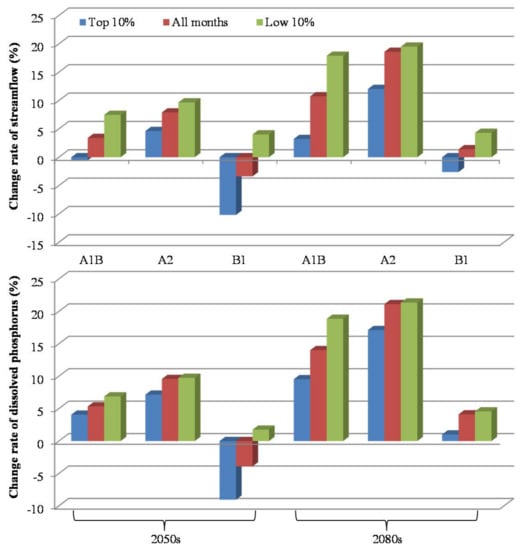 In addition, The Dis-P fluxes, together with streamflow yields, in extreme years under projected future climate scenarios were examined. The mean values of the top 10% highest and bottom 10% lowest annual streamflow and Dis-P fluxes for each scenario and the baseline level were compared with the all-years mean values, the results of which are illustrated in Figure 6. We could determine that the streamflow and Dis-P fluxes had similar trends; the changing trends under the two extreme conditions were similar to that of the mean value but that there would be more increases in streamflow and Dis-P fluxes in the original low-flux years but fewer increases in the original high-flux years. These results implied more Dis-P flux risks during low-flow year periods in the future, which should be of great concern for local water environmental management decision-makers facing concentration control.