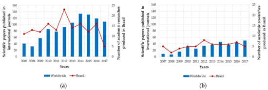 In order to analyse whether national production follows the pace of international studies, quantitatively and temporally, Figure 1 shows the number of academic researches published in Brazil and papers published worldwide over 2007‒2017.
