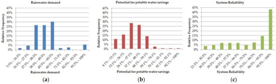 Figure 3. Histograms of (a) rainwater demand; (b) potential for potable water savings; and (c) system reliability, resulting from research data on rainwater harvesting in residential buildings obtained from [68,69,74,75,76,80,81,94,95]. (a) Rainwater demand, (b) Potential for potable water savings and (c) System reliability.