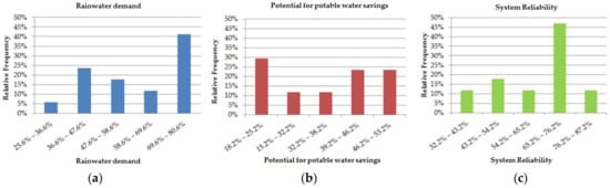 Teston et al. [87] compiled nine national researches on the potential for potable water savings through the use of rainwater in residential buildings and obtained results for 158 cases. Using this compilation, when it comes to residential buildings, Figure shows the frequency of (a) rainwater demand; (b) potable water savings; and (c) system reliability.