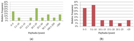 Figure 5. Percentage frequencies of the paybacks in (a) residential and (b) commercial and public buildings. (a) Residential Buildings; (b) Commercial and public buildings.