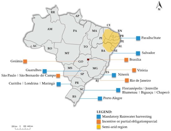Considering the Brazilian government scenario, rainwater harvesting is encouraged by legislation in several cities, either because it is a sustainable strategy or because it is a policy of access to water in semi-arid cities. Those are two different approaches. Brazil has a semi-arid area in the northeast region (highlighted in Figure 6), and the first approach is about how the public policies are related to rainwater harvesting in order to promote water access in such area.