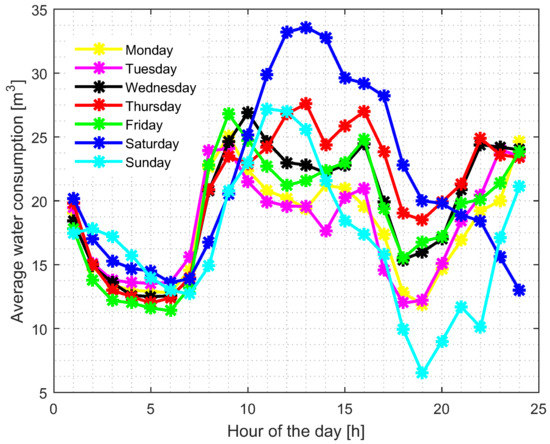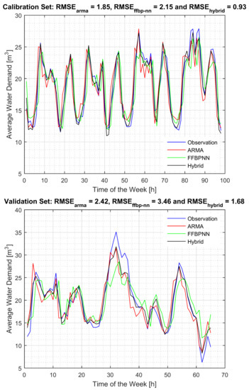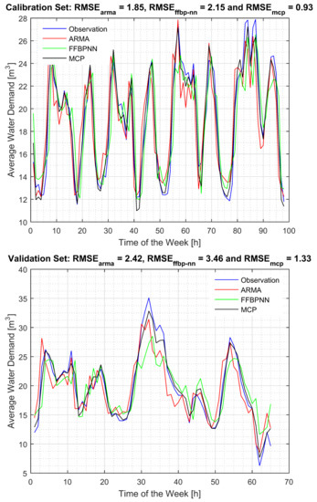 The predictive performances of ARMA, FFBP-NN, the hybrid model and the MCP are assessed based on a 168 h (one week) long set of data sampled at hourly time steps estimated from observations by averaging eight weeks of observations (see Figure 1). These averages were the only available data from a case study site located in a hydraulic zone in the small city of Alquerias (Murcia) in south-eastern Spain, which has a population of approximately 5000 consumers and an extension of nearly 8 [31]. The number of data used for the calibration and validation sets are approximately 60% and 40% respectively, where the first 100 h are used for calibration.