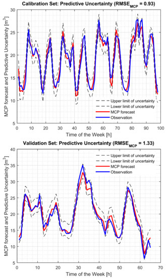 Furthermore, decisions such as releasing sufficient amount of water to users may be linked to losses such as loss in users credibility, or more consistently in terms of contractual penalties if the objective is not met [16,24]. At the same time, releasing too much water may lead to wastes, thus to potential economical losses. This is why, by means of a predictive density of future demand, one should compromise between the cost of water, including loss of future opportunities injected into the water distribution network (WDN) to meet future demand and the expected value of losses if the demand objectives are not met. The point is that once the decision is made on how much to inject into the WDN, what is injected is a real physical quantity which has a real cost also in terms of lost opportunities, while the economical losses depending on the future actual demand are still uncertain. This is why, to compromise between the real costs for wasting water and the expected losses for not meeting demand, one needs first of all to assess the probability of future demand, conditional on all our available knowledge, and use this information to estimate the future expected losses by integrating the loss function, which depends on demand, times the probability of demand, over the entire domain of possible demands [18,24,28]. Models are the tools to allow us to correctly assess such an uncertainty, but they are not the final goal. Many researchers in the field of hydrology have looked into the problem of assessing the PU connected to a real-time flood forecasting system using the MCP [16,17]. However, to our knowledge, only Alvisi et al. [18] have used MCP to assess the PU within the framework of water demand forecasting on the basis of the forecasts generated by using two deterministic models, namely a cyclicity and persistence based model (Patt-for) and a feed-forward back propagation neural network (FFBP-NN).